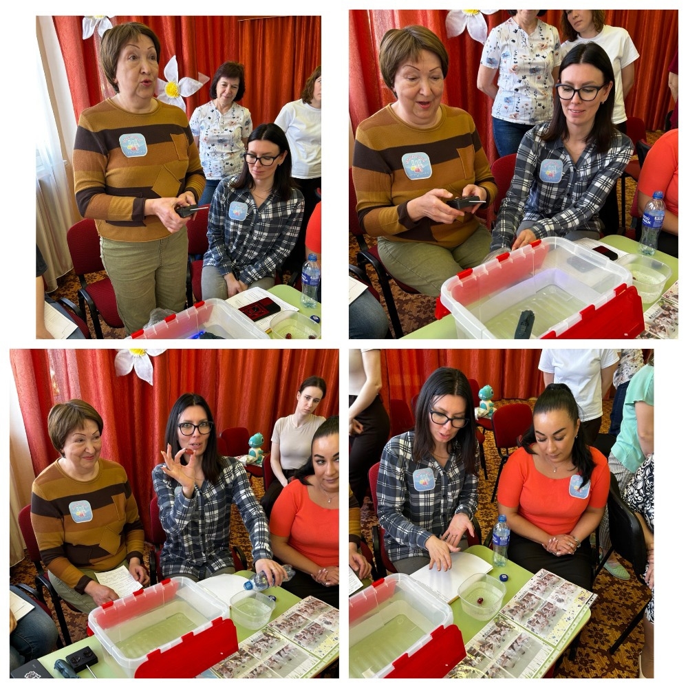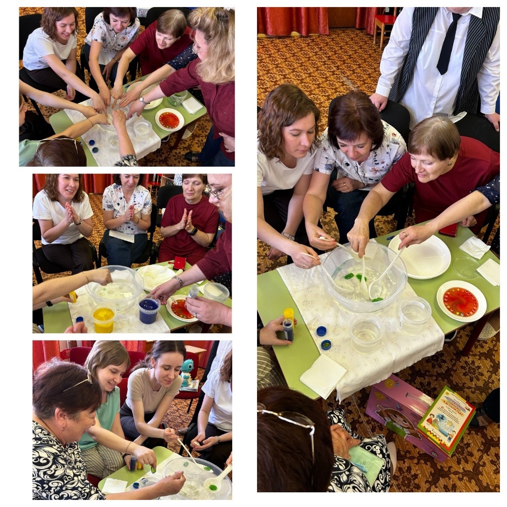 Самым ярким моментом стала деловая игра. Воспитатели разделились на четыре команды по возрастам: «Почемучки» (младшая группа), «Искатели» (средняя), «Лаборанты» (старшая) и «Исследователи» (подготовительная). Каждая команда показала свой опыт: от «Тонет – не тонет» до «Извержения вулкана».