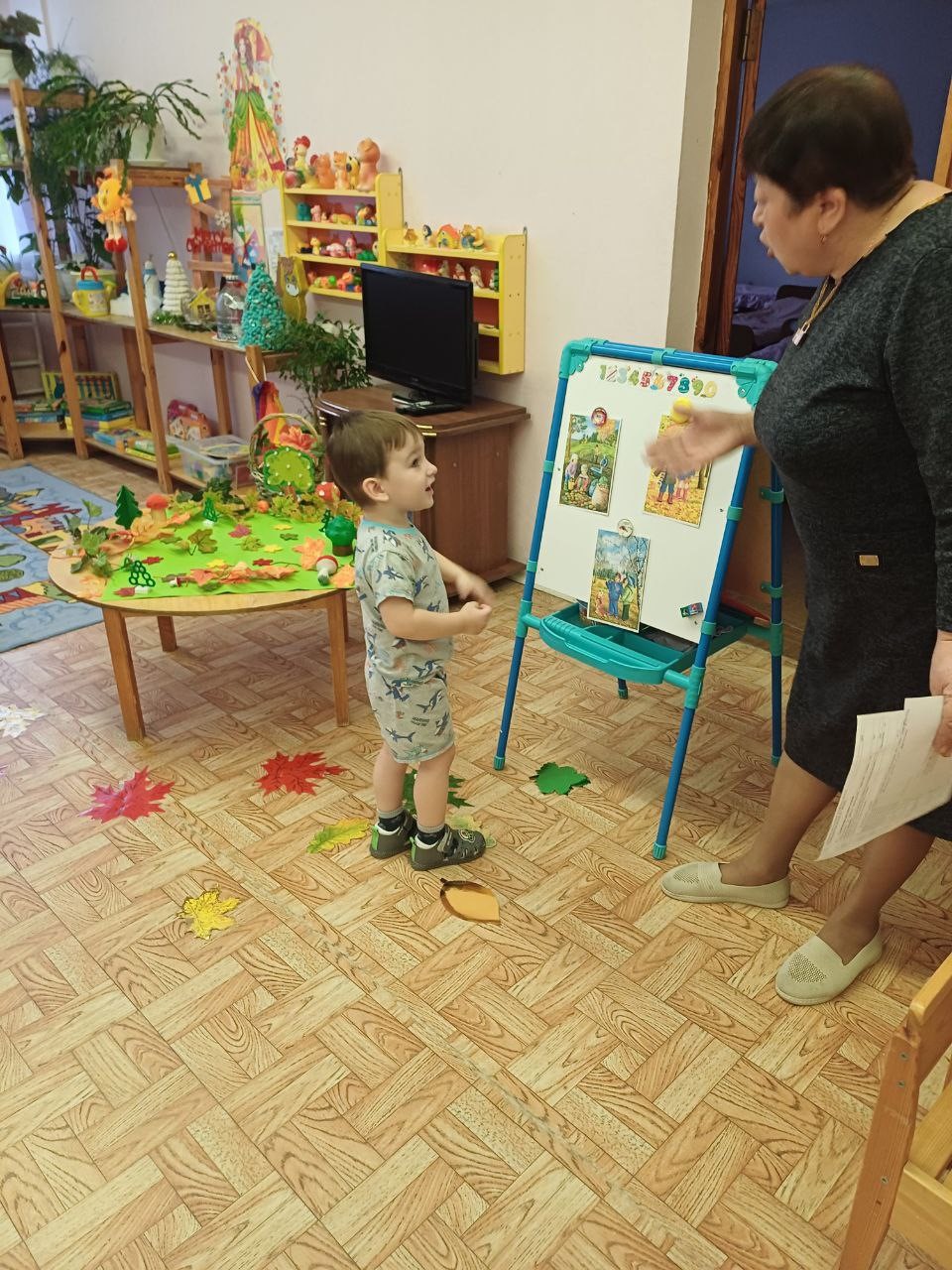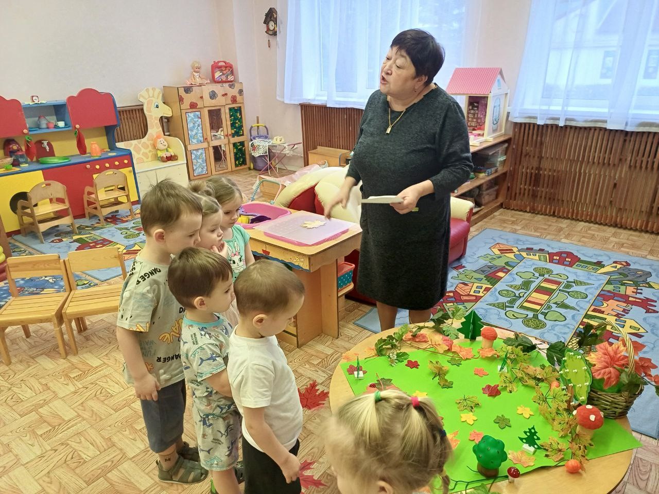 Во время путешествия в волшебный лес ребята вспомнили и закрепили названия периодов осени: ранняя, золотая, поздняя. Дети, попав в волшебный лес, сразу догадались, что это осень разукрасила лес и принесла корзинку. Угадав загадки, ребята разложили овощи в корзинку, а фрукты в ведёрко. Поиграли с листьями. Рассказали красивые стихи про осень. Занятие получилось интересным вдохновляющим. Дети охотно играли на протяжении всего путешествия и получили массу положительных эмоций.