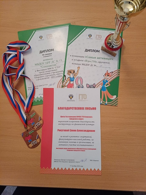 По результатам испытаний дети получили заслуженные знаки ГТО и с результатом 4057 очков заняли почетное 3 место среди детских садов города!